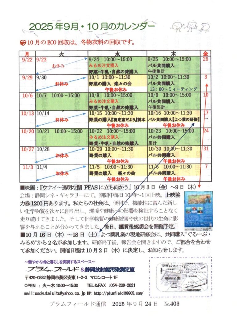 2025年10月・11月の活動カレンダー♪💝10月のECO回収は冬物衣料を集めます。💝プラムフィールドでは10月の映画上映『ウナイ~透明な闇 PFAS汚染に立ち向かう~』(10月3日(金)~9日(木)の上映協力券(申し込み締め切り10月1日まで)を取り扱っています。