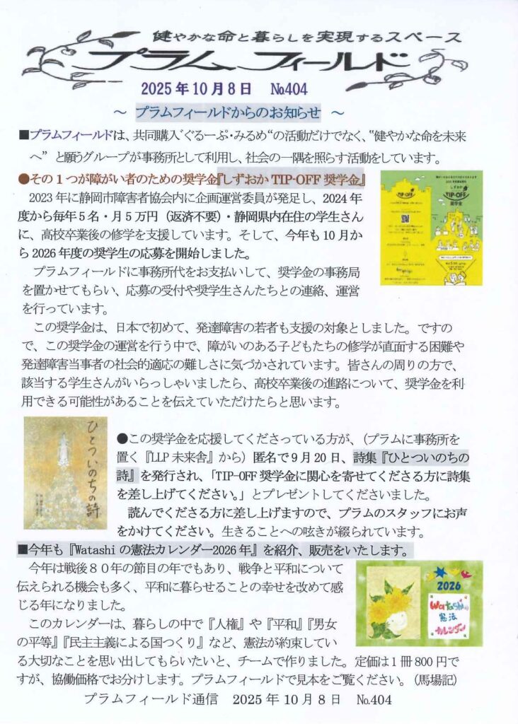 プラムフィールド通信2025年10月8日 №404 プラムフィールド・メッセージ ~プラムフィールドからのお知らせ~ by 馬場利子