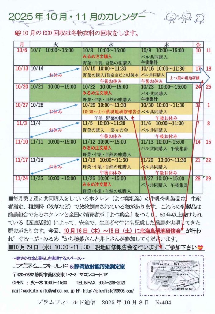 2025年10月・11月の活動カレンダー♪💝10月のECO回収は冬物衣料を集めます。10月29日(水)10:30~11:30 よつ葉産地交流会(10月17日・18日)報告会 参加費無料&小さなお菓子付き♪