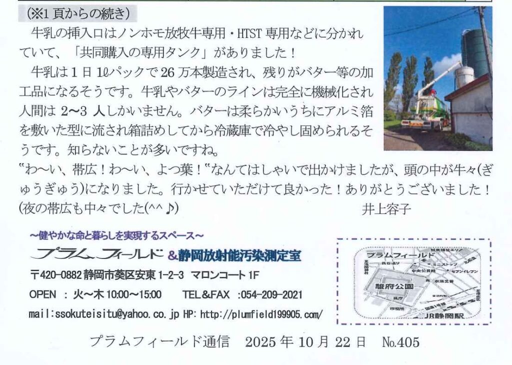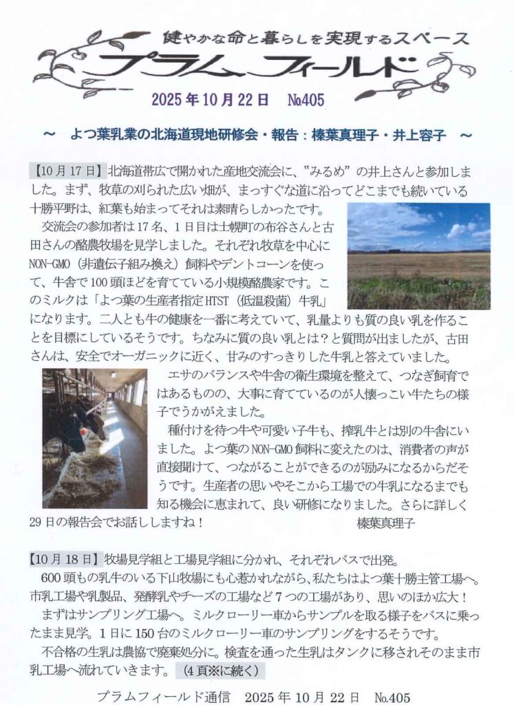 プラムフィールド通信2025年10月22日 №405 プラムフィールド・メッセージ ~よつ葉乳業 北海道現地研修会・報告~ by 井上容子&榛葉真理子