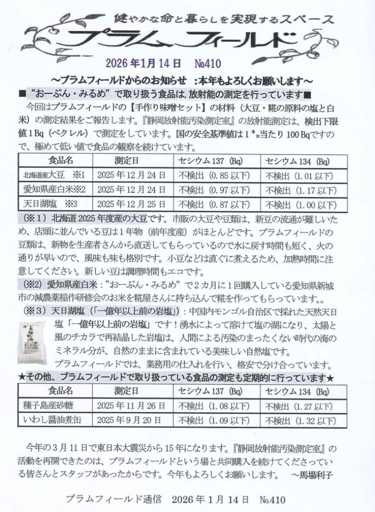 プラムフィールド通信2026年1月14日 №410 ~プラムフィールド・メッセージ~プラムフィールドからのお知らせ:‟おーぷん・みるめ”で取り扱う食品の放射能測定結果報告~ by 馬場利子